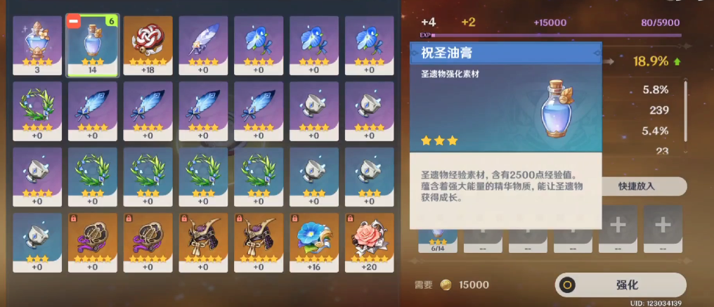 祝圣油膏相比直接消耗低级圣遗物作为强化材料,能更高效地提升目标圣遗物等级。使用时建议集中强化主词条优秀的五星圣遗物,避免分散消耗。与祝圣精华相比,油膏性价比更高但单次提供经验较少,可根据实际需求灵活选择兑换比例。