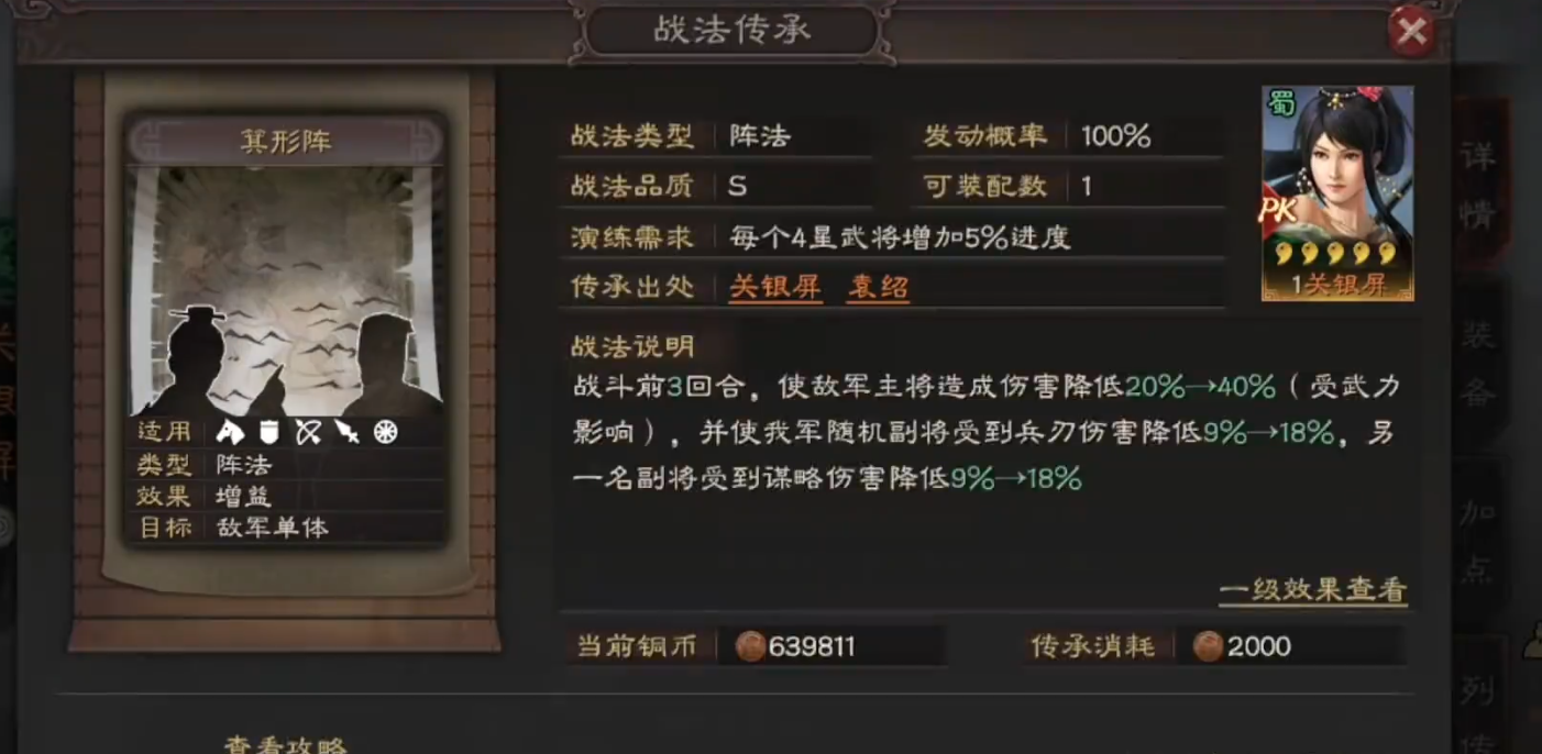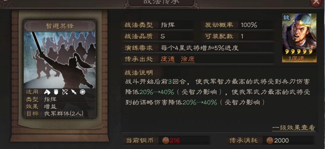 箕形阵是一种防御性阵法,主要针对敌方主将输出进行压制,同时为友军副将提供减伤效果。若玩家暂时无法获取该战法,可考虑使用纵兵劫掠作为替代选择。纵兵劫掠属于A级战法中的强势选项,具备较高的泛用性,尤其适合搭配武力型武将。其优势在于无需特定兵种限制,且能通过控制效果弥补团队防御短板。需纵兵劫掠虽无法完全复制箕形阵的减伤机制,但能通过打断敌方节奏间接实现类似战术目标。