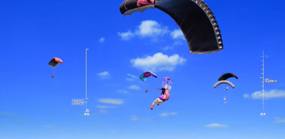 跳伞的准确性直接影响落地后的物资获取和战术优势。跳伞过程分为开伞前和开伞后两个阶段,开伞前阶段通过控制视角和速度调整飞行方向,开伞后则需精细操控降落伞落点。地图上的黄色大格边长1000米,白色小格100米,利用网格可精准估算距离。镜头朝向决定空气阻力分布,俯冲时镜头朝地并按W键可加速至234km/h,开伞后因惯性会继续快速下落一段距离,这是抢先落地的关键。