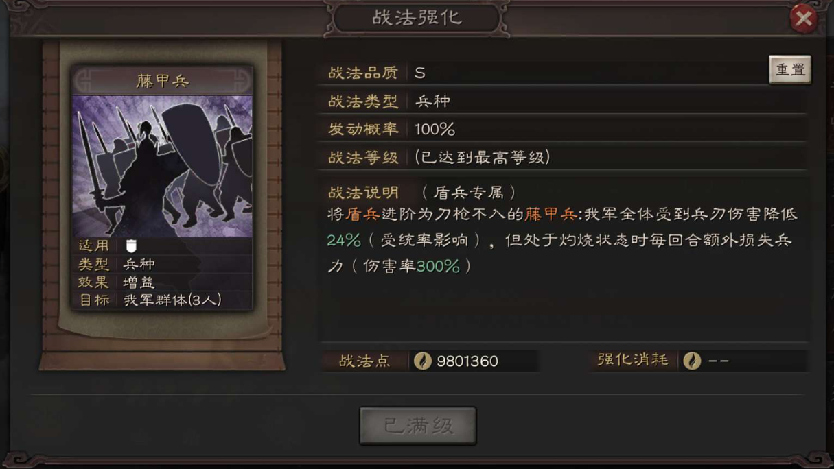 藤甲盾以其极高的兵刃抗性著称,但骑兵通过合理的战术搭配仍能有效破解其防御体系。关键在于利用兵种克制、火攻战法、控制技能以及高爆发输出的组合。骑兵对盾兵存在20%的伤害加成,这是基础优势,但需结合特定战法才能突破藤甲的特殊减伤效果。