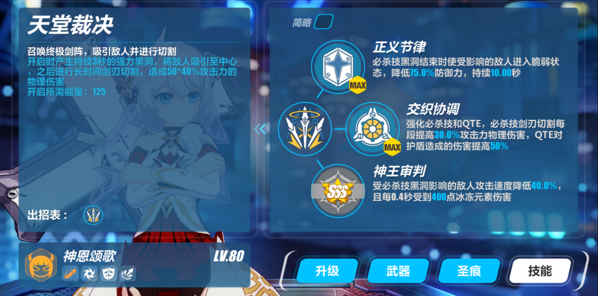 神恩颂歌作为异能属性的辅助角色,在团队中主要提供回复和脆弱效果。她的QTE技能容易被触发,配合特定角色如圣仪装·今样可以形成高效的输出循环。在深层空间等特定关卡中,神恩颂歌的辅助能力对通关至关重要。圣女祈祷同样是值得关注的异能辅助,她的治疗和防御加成在持久战中价值显著,装备选择上建议以提高治疗量和生存能力为主。