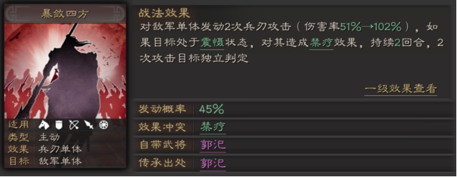 徐盛可选的B级输出类战法包括避实击虚强攻和暴敛四方。避实击虚能针对统率最低的敌军单体造成高额兵刃伤害,配合徐盛自带战法提升的武力值可显著提高爆发能力;强攻提供连击效果,增加普通攻击次数,适合搭配突击战法;暴敛四方则能对目标发动两次兵刃攻击,若目标处于震慑状态还可附加禁疗效果。这些战法均能有效弥补紫将属性不足的短板,同时契合徐盛的武力成长特性。
