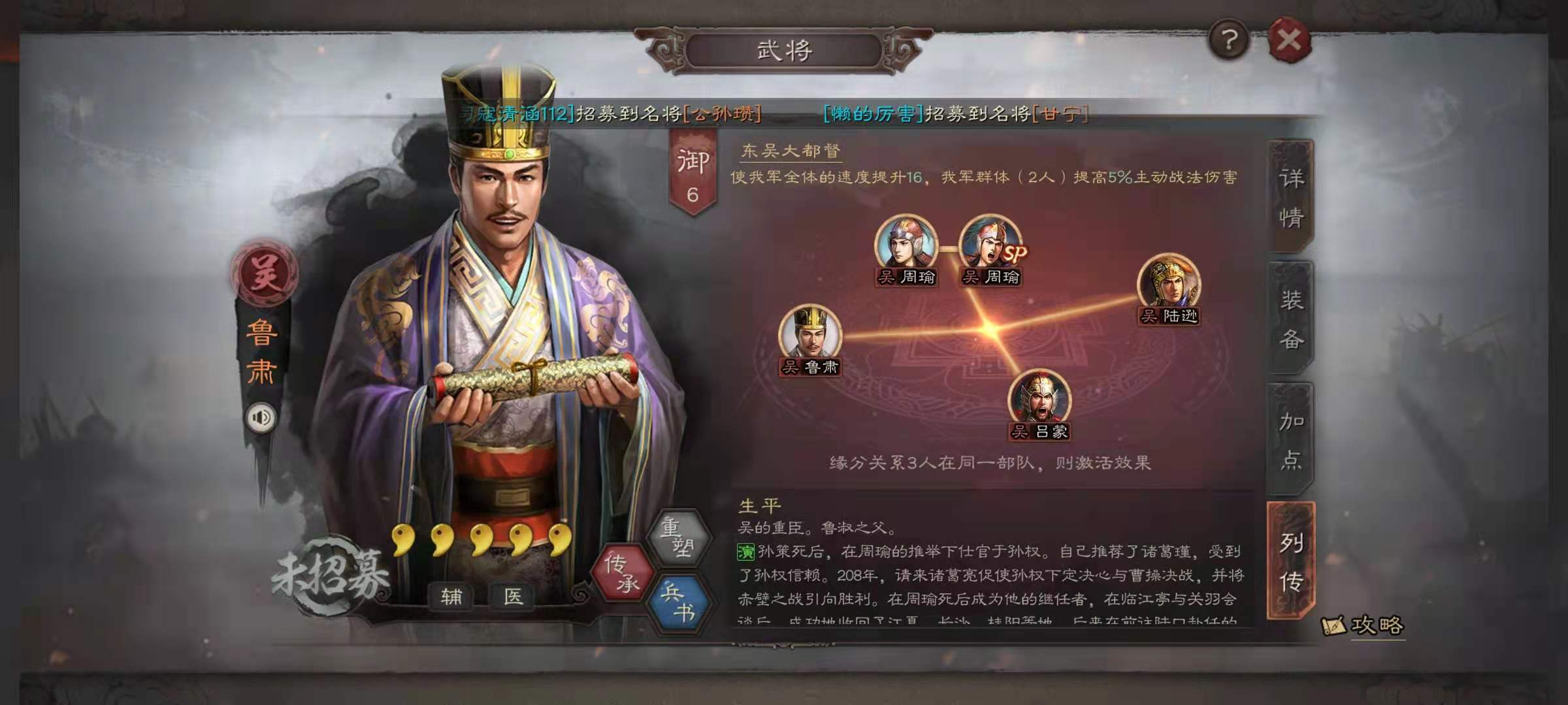 鲁肃作为吴国辅助型武将,其战法济贫好施可在第二回合将自身40%属性转移给兵力最低的友军,后续回合提供治疗与减伤效果,但兵种适性全A的限制使其属性移交后自身生存能力下降。凌统的国士将风在前三回合为友军提供先攻、必中和伤害加成,随机性较高的特性使其更适合单保二阵容。周泰的肉身铁壁通过叠加统率提升防御并恢复兵力,是典型的防御型武将。蒋琬作为内政特化武将,其克遵画一可提升石料产量,但实战价值相对有限。