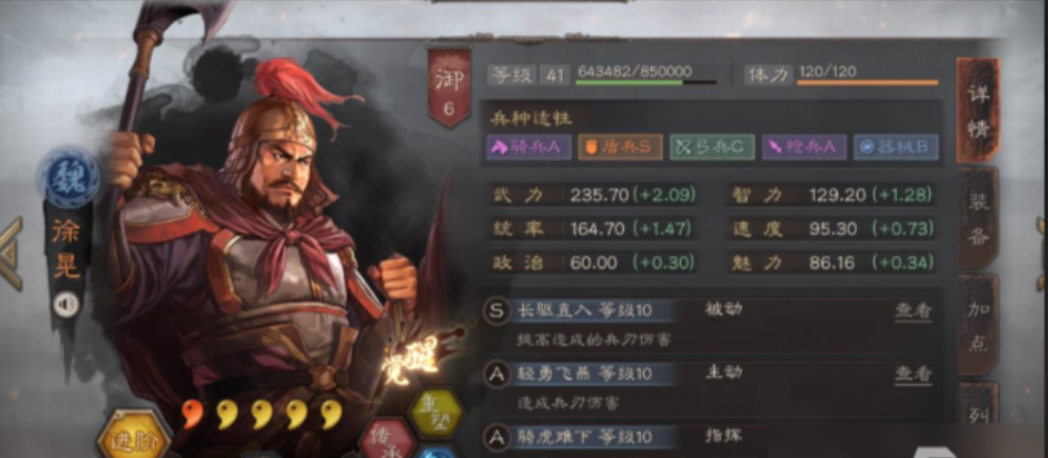 盾兵本身防御高,但怕火和法伤,所以遇到法师队时,可以给典韦或曹仁这类肉盾补点智力,减少被秒的风险。比如典韦带个气凌三军,加点可以武力为主,统率为辅,这样既能反击又能站得住。徐晃则是典型的暴力输出,加点无脑堆武力,配合轻勇飞燕这类战法快速叠被动,中后期伤害爆炸。