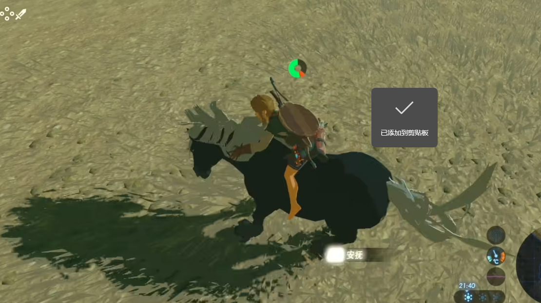 从马的正后方蹲下潜行能降低被发现的概率,高警觉度的优质马建议穿戴忍者套装提升隐蔽性。也可选择从高处滑翔直接降落在马背上。接近后按A键骑乘,立即连续按压L键(非长按)进行安抚,此过程会持续消耗耐力,需提前准备精力料理补充。