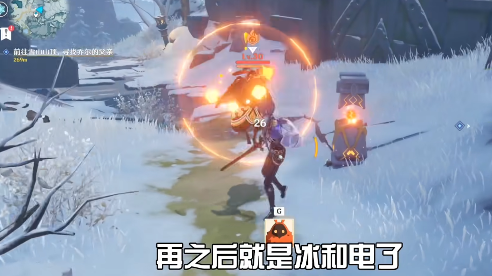 第一块碎片位于覆雪之路传送点附近的忍冬之树旁。周围分布四块深赤之石,击碎后拾取可获得短暂的红石buff,用其攻击封印的碎片四次即可解冻。建议优先清理附近的敌人,避免干扰。解冻后忍冬之树会被激活,后续可通过供奉雪山的红玉髓获取奖励。