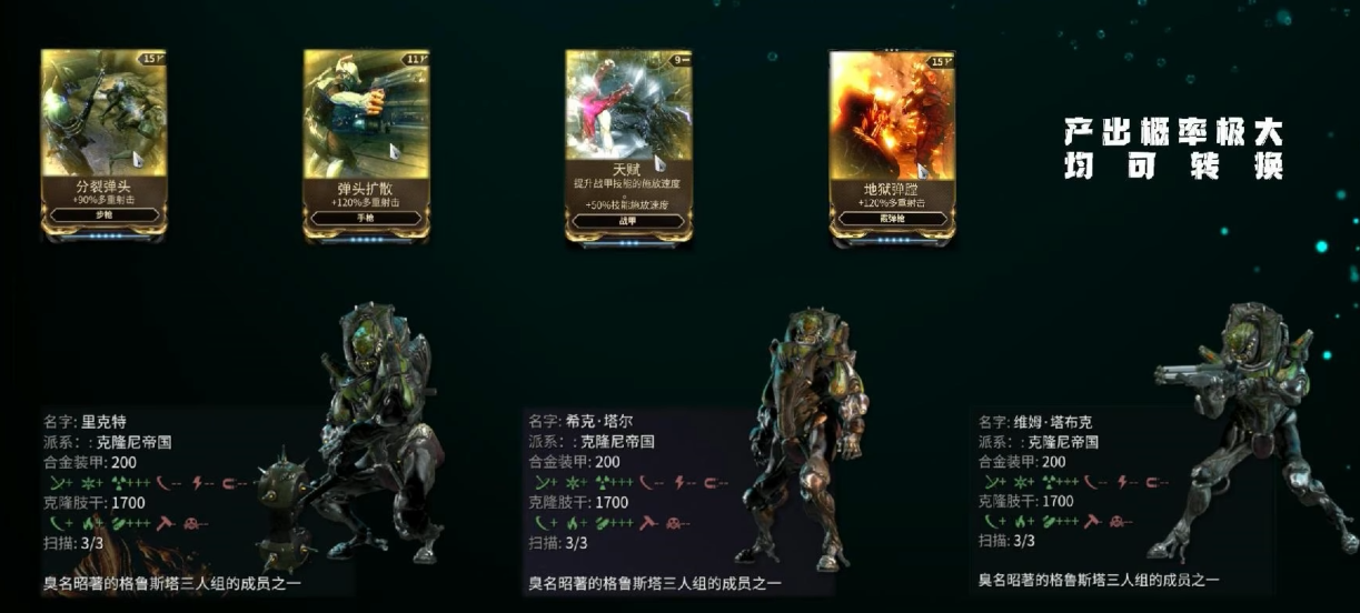 三G佬各自有独特的战斗方式,Vem Tabook使用定制版Hek散弹枪,Shik Tal擅长盾牌防御,Leekter则挥舞着重型锤子。面对他们时建议准备好腐蚀或辐射属性的武器,腐蚀能有效削弱他们的护甲,辐射则能让他们自相残杀。战甲方面推荐使用控制型或高生存能力的战甲,比如犀牛或冰雪寒霜,能够更好地应对他们的围攻。注意躲避Vem Tabook的散弹枪爆发伤害,优先解决治疗者Shik Tal。