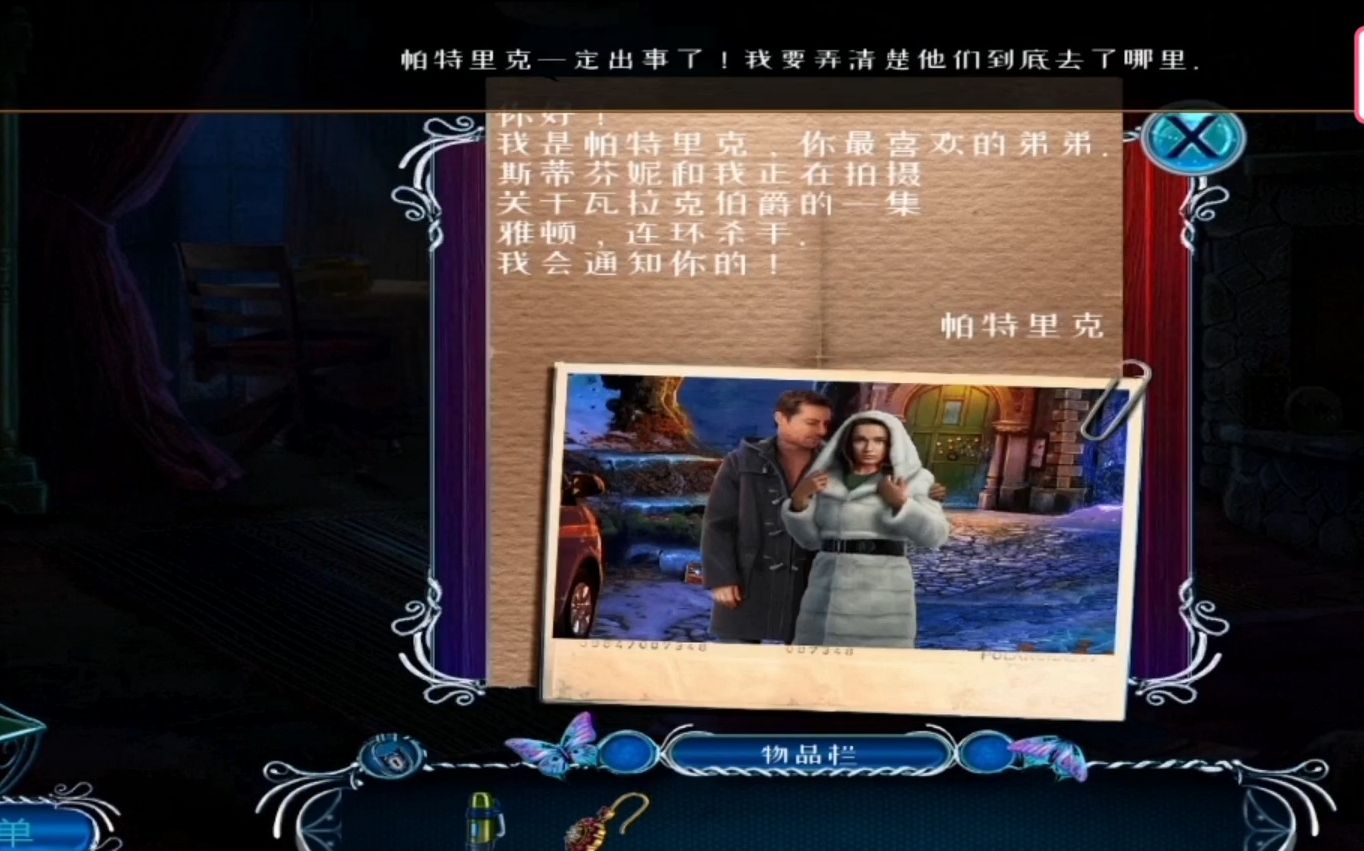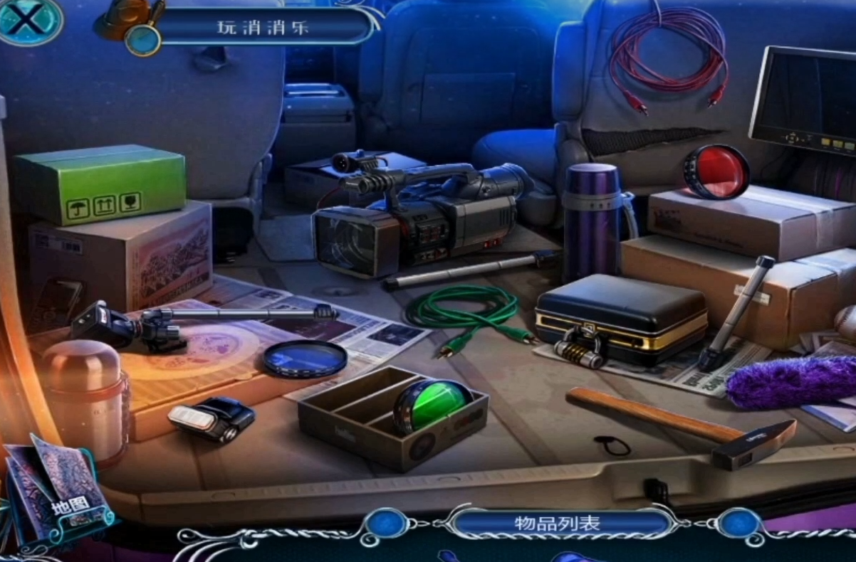 玩家需要从剧院入口开始探索。首先在右侧台子获取手杖把手和轧票钳,用轧票钳取下门上的木板获得藤杖头,将藤杖头与手杖把手组合成完整手杖。使用手杖点击旗子可进入剧场房顶场景,此处需收集猫头鹰标志碎片和撬锁工具。在房顶左侧雕像的包内找到撬锁工具后,将猫头鹰标志安装在包上可获得镜框、镜片等组件,组合成双目镜用于观察圆顶获取暗门密码。