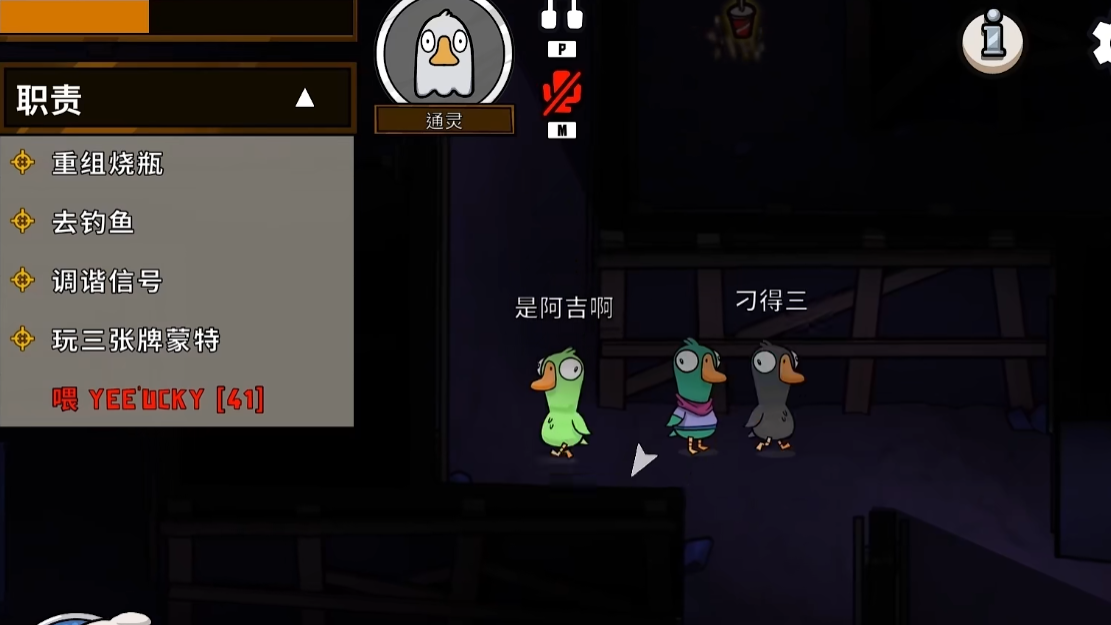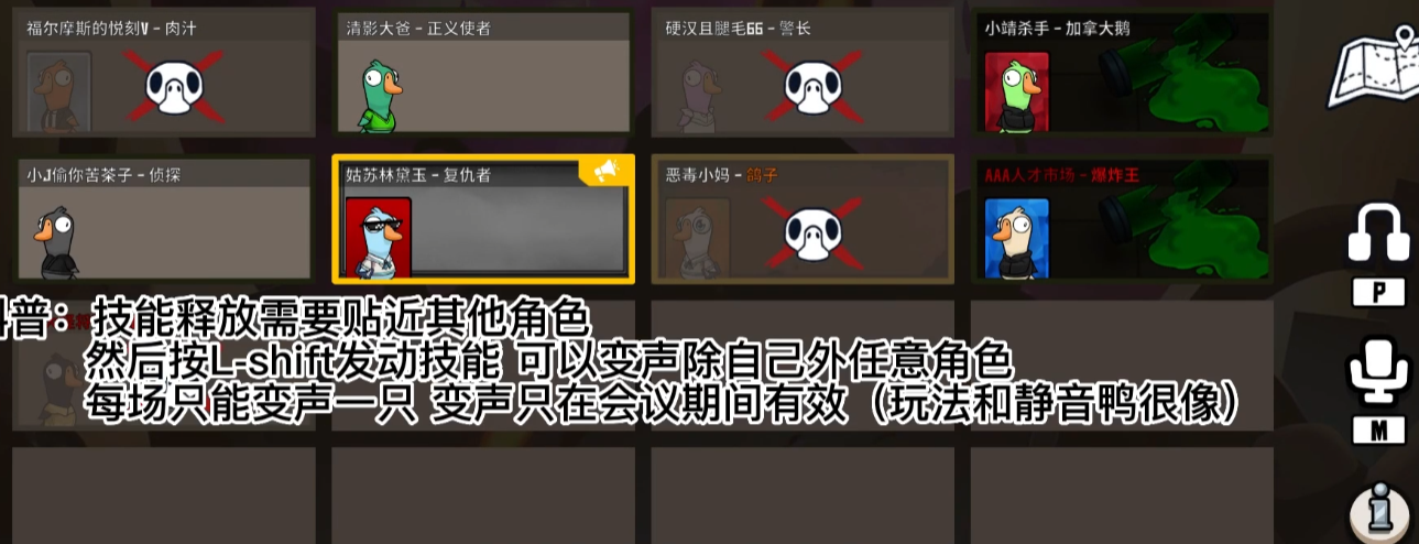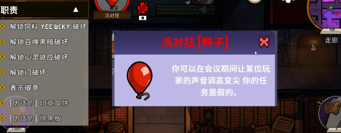 派对狂的技能机制需要明确操作细节。玩家需贴近目标后按下Shift键激活技能,每轮会议仅能对一名玩家生效,且无法对自己使用。技能释放后仍可正常使用通风管道等场景交互功能,但需注意冷却时间为17秒(首轮会议后增至20秒)。与其他鸭子阵营角色不同,派对狂的击杀能力与普通鸭子一致,使用空格键进行攻击,冷却时间同样遵循基础设定。