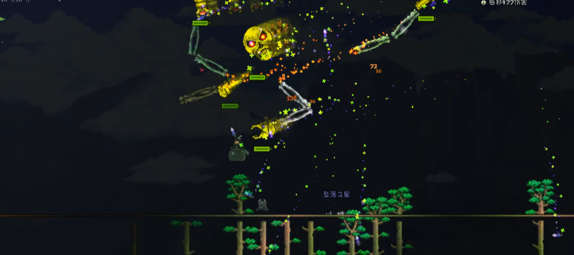 机械骷髅王是机械三王中难度最高的存在,头部为唯一致命弱点。战斗前需准备多层平台并配备传送器,重点破坏其四种手臂——优先解决炮臂和激光臂可大幅降低战斗压力。当Boss进入旋转状态时防御和伤害翻倍,需保持移动躲避。神圣子弹配合巨兽鲨机枪是有效输出手段,建议携带十字项链延长无敌帧。黎明前未击败会触发狂暴状态,需严格控制战斗节奏。