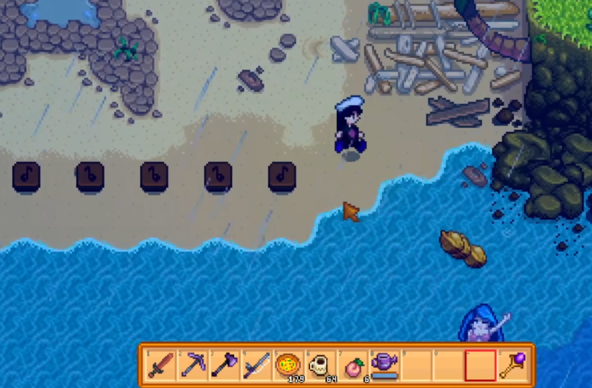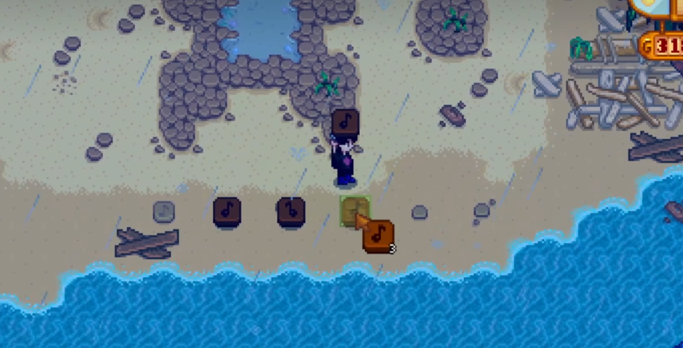 任务执行阶段需特别注意天气与位置。美人鱼仅在雨天出现于姜岛东南部海岛湾的礁石区域,玩家需提前用20个金核桃修复度假村以清除路径障碍。携带5个长笛块前往目标地点后,需将其放置在沙滩特定的小石块周围。长笛块的音调通过交互次数调整,小石块代表1次交互,大石块代表5次交互。