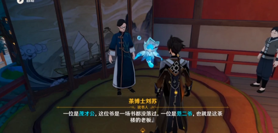 拿到裁雨声·上或裁雨声·中后,咱们得去找茶博士刘苏。把上篇交给他,他会开始讲述裁雨声的故事,听完后再把中篇交给他,他会继续讲下去。他会自动补全裁雨声·下的内容。全部听完并交付后,就能解锁成就旅者且留步了。