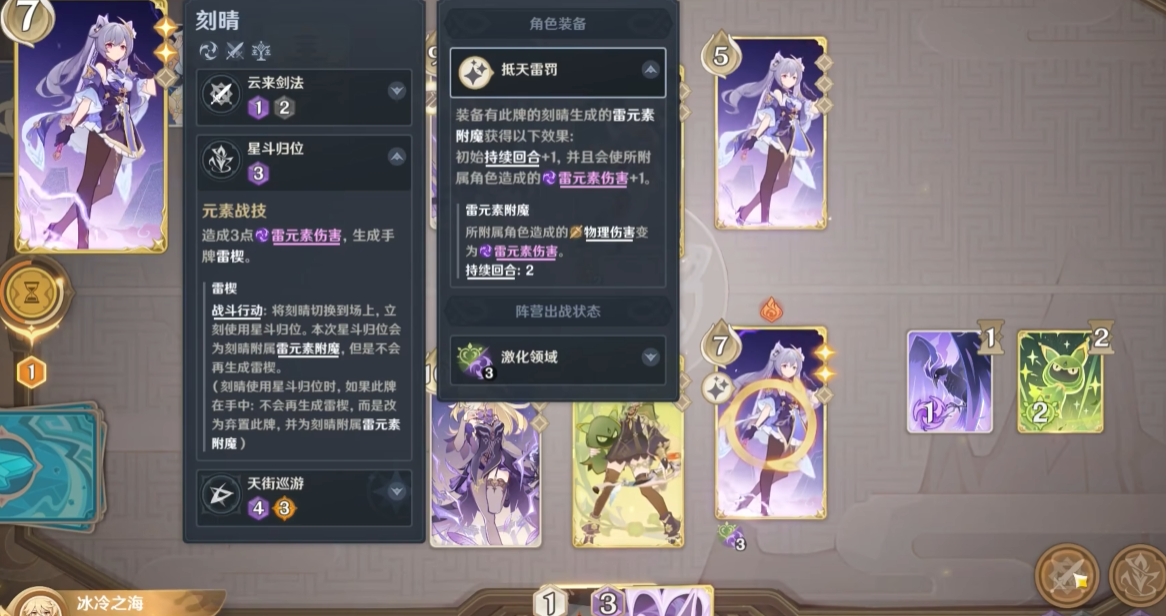 卡牌配置方面,除了角色牌,重点携带骰子调整类卡牌如最好的伙伴运筹帷幄,确保关键回合的骰子充足。支援牌推荐带刘苏加速充能,以及交给我吧这类切人牌减少行动消耗。装备牌优先选柯莱专属武器提升草伤,刻晴可带狼的末路增强收割能力。记住激化队是速攻套路,不要拖到后期。
