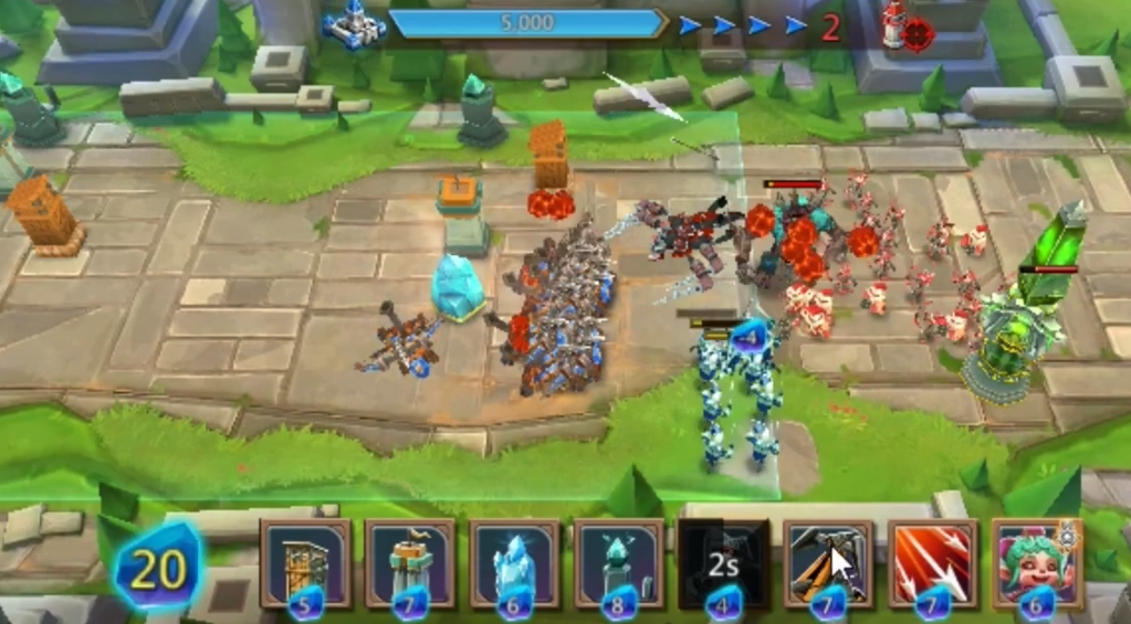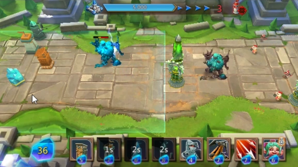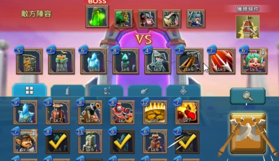 面对敌方密集的炮塔群,需要采用分阶段推进策略。第一阶段应部署巨石车和火焰车等攻城单位,配合冰冻塔减速效果集中火力拆除第一座炮塔。第二阶段需注意第三座炮塔的交叉火力,可放置魔法塔吸收伤害,并利用闪电塔的高爆发特性快速削减敌方防御。英雄方面推荐携带具有200%对英雄伤害加成的图腾,其远程输出特性可有效规避近战单位的快速阵亡风险。