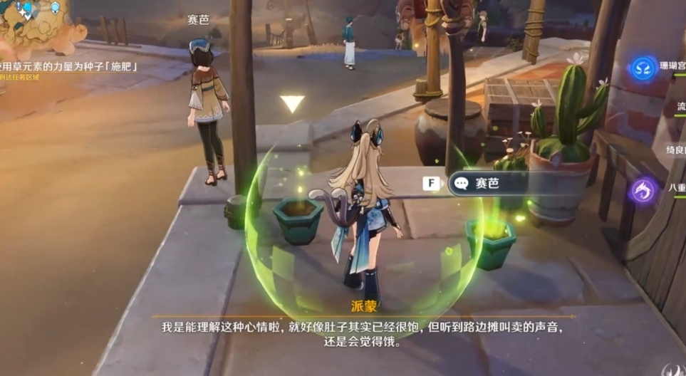 流浪者任务是须弥地区的世界任务,分为多天完成,需要现实时间推进。任务起始于阿如村,与NPC赛芭对话触发剧情。第一天任务名为流放者·萌芽,使用草元素对三个花盆施肥后进入后续剧情,花盆中的种子会发芽,任务完成后需等待现实时间的第二天继续。