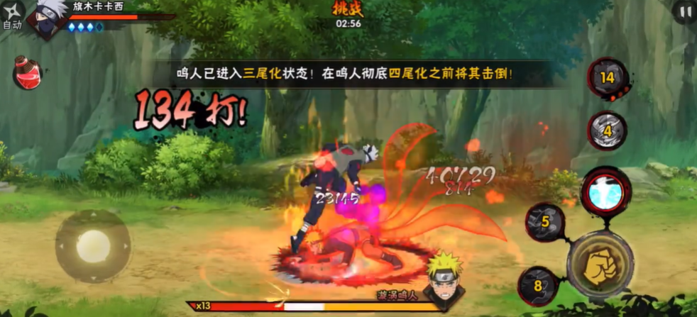 战斗过程中需注意火球坠落规律,首次火球为全屏攻击,玩家需与鸣人保持同一Y轴位置规避伤害;第二次火球会追踪玩家当前位置,需及时位移闪避;第三次恢复全屏模式后循环此机制。鸣人每提升一条尾巴力量时会在周身范围触发爆气伤害,近战忍者需格外注意攻击节奏。建议选择爆发型忍者如宇智波鼬或漩涡鸣人九喇嘛连结,利用奥义无敌帧规避关键伤害,同时保留查克拉用于尾兽化阶段的集中输出。
