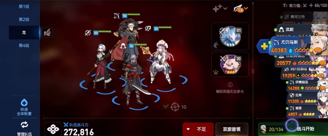 通关龙13的核心思路是组建水系队伍,利用属性克制机制降低战斗难度。推荐阵容为安洁莉卡(水奶)、赛珂兰特(旧水镰)、尤贝乌斯(开水哥)和武蔚(5v),这套阵容中仅有武蔚需要抽取,其他角色均可通过任务免费获取。水奶需要优先培养至60级并穿戴75级生命套,装备强化顺序为头盔、衣服、鞋子等防御向部位,确保其生存能力。赛珂兰特作为主力输出需配备攻击套,优先强化武器和项链。