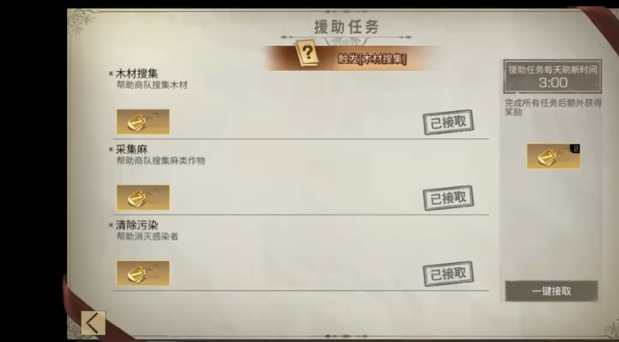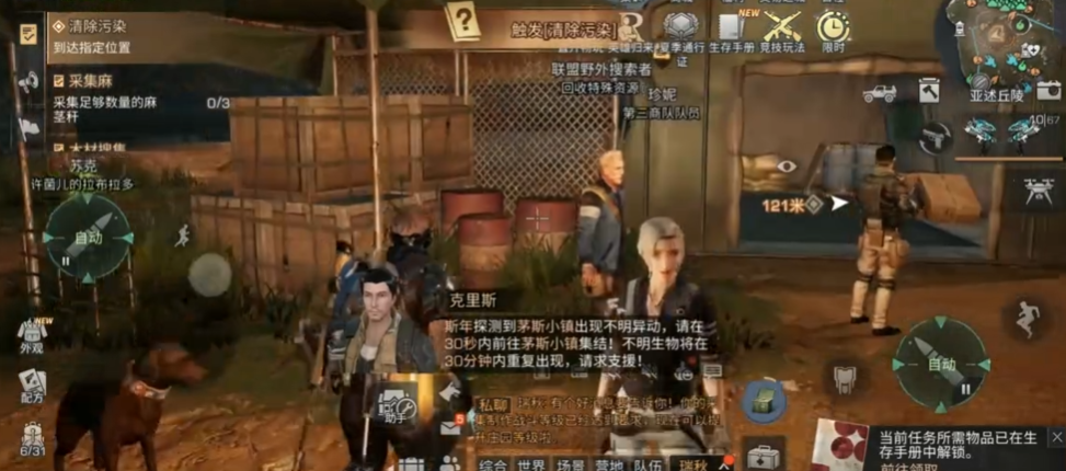 援助任务的具体内容会根据地图动态刷新,例如黎明区的拍摄任务相对简单,而需要寻找特定NPC的任务可能耗费更多时间。完成任务后,玩家可获得金条等奖励,但需注意部分任务要求采集资源后必须拾取掉落物品才算完成。资源点可能刷新敌对生物,建议提前做好战斗准备。