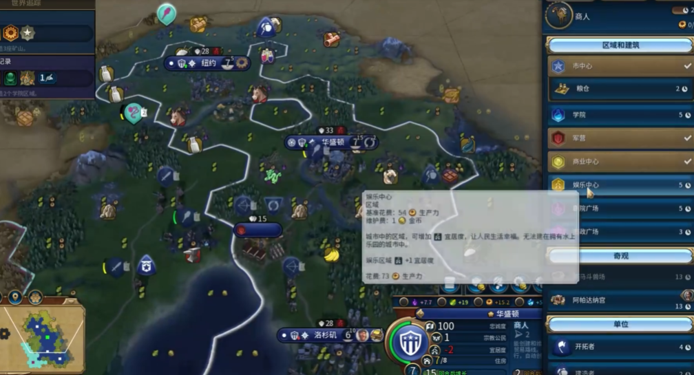 中期咱们得多铺城,尤其是沿海城市,方便后期造海滨度假区。剧院广场不用急着建,先靠莽骑兵打架赚文化值,等电影制片厂出来再集中爆发旅游业绩。工业区和商业区也要均衡发展,毕竟造奇观和买自然学家都要大量生产力。别忘了和其他文明搞好关系,旅游业绩要靠他们来消费,如果遇到战狂邻居,就用罗斯福的战斗力加成教他们做人。