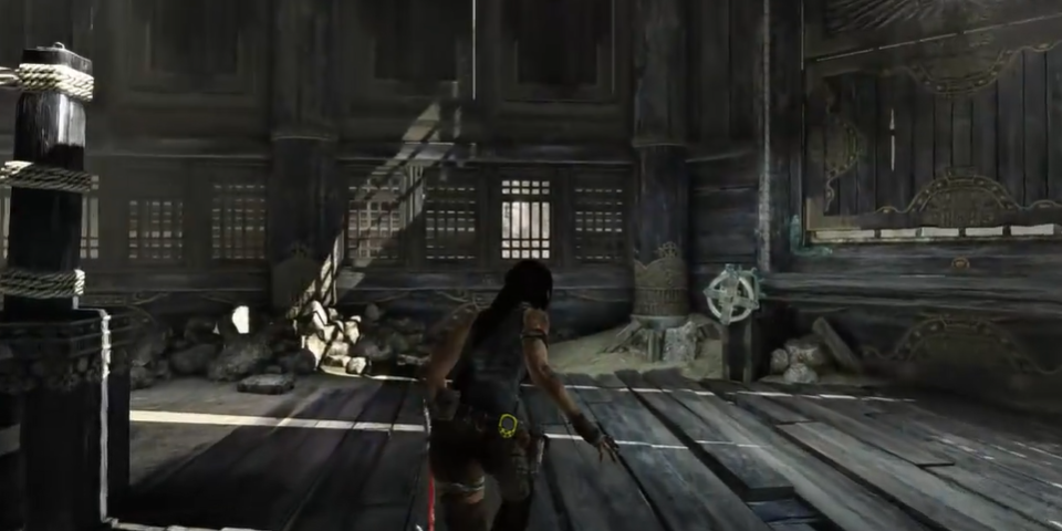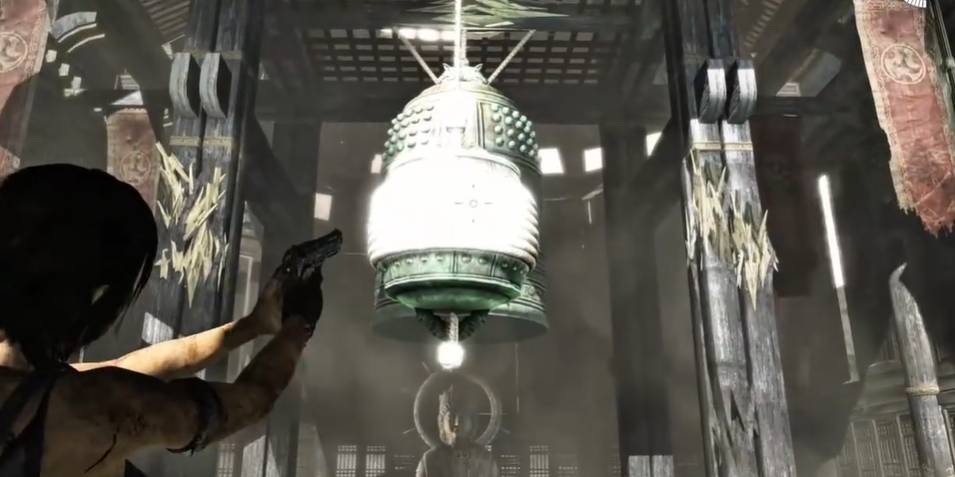 先打开其中一扇窗,强风吹进来会让钟摆摆动。用弓箭射击钟摆并拉动它,借助风力撞击一侧的支撑柱。记得关掉这扇窗,再打开另一侧的窗,重复同样的操作撞断另一边的柱子。这一步需要耐心,如果钟摆摆动幅度不够,可以多用绳索箭矢调整位置。