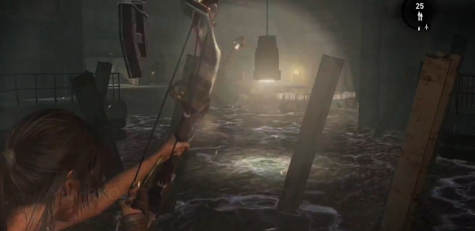 再次回到水闸处拉开开关注满水,从门洞游进木筏的房间,通过木筏跳上入口。用绳索箭矢拉开内侧木栅门,进入后会遇到更多变异人,清理完毕后到水坑另一边拉动开关提高水位。站在木筏上用绳索箭矢将木筏和前方水车转轴相连,木筏会被拉近水车,靠近后跳上水车转轴所高台。