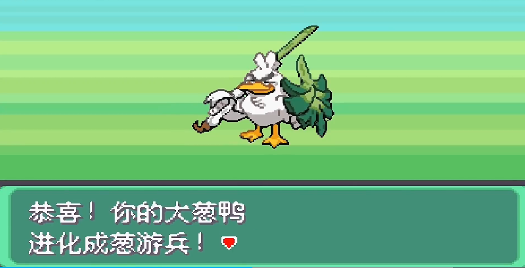 战斗结束后,如果条件满足,系统会提示大葱鸭的样子不对劲,这时候它就会自动进化成葱游兵啦!进化后的葱游兵不仅外形更酷,战斗能力也会大幅提升,尤其是格斗属性的招式会变得更厉害,绝对是队伍里的强力打手。最后火红版的大葱鸭必须是伽勒尔地区的形态才能进化,普通形态的大葱鸭是无法进化的。
