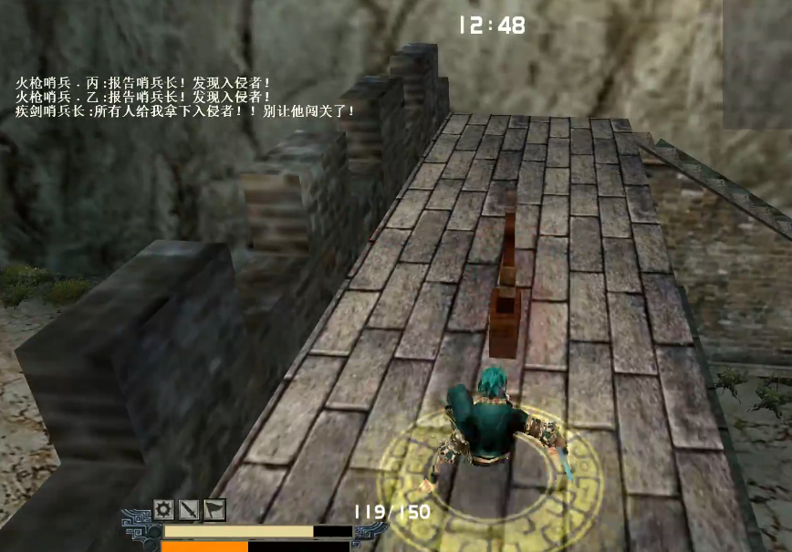 信物获取后需破坏栅栏进入下一区域。地图右侧的火枪哨兵会远程攻击,建议优先解决近处的哨兵丙,再使用地图中央拾取的大刀以←→A招式快速破坏栅栏。栅栏外的火枪哨兵据点藏有机关装置,触发后可短暂开启红色大门,需把握时机迅速冲入。此阶段不必纠缠剩余敌人,专注突破关卡即可。过程中需灵活运用轻功躲避火枪攻击,并保持信物始终在身。