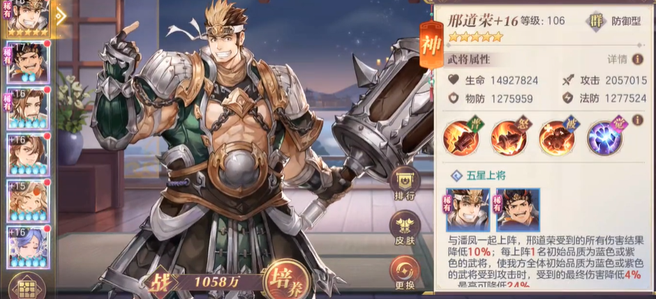 潘凤的核心技能旋转风暴可对敌方攻击力最高单位造成210%物理伤害并附加防御力150%的真实伤害,但会陷入1回合沉默状态。这种自损式设计通过五星被动无能狂怒形成循环体系——当沉默被驱散或结束时立即回复1000怒气,配合驱散型武将可实现短时间多次怒攻。专武觉醒后,沉默状态下的免伤提升至50%,且每存在1名蓝紫武将可为全队提供最高48%最终伤害加成,使其成为蓝紫将体系的核心输出点。