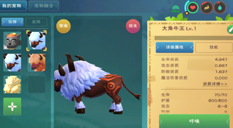 创造与魔法大角牛作为45级可捕捉的生物,在宠物与坐骑功能上各有优劣。从资质来看,大角牛初始生命值为80,攻击6,防御13,作为战宠时具备挑衅技能,能吸引怪物仇恨;作为坐骑时速度在6500-7000之间,负重30-35kg,属于中等偏上的陆地移动工具。其饲料配方为小麦饲料包+白莲饲料包+稀有肉(16包),材料获取难度适中,适合中期玩家培养。两种用途的核心差异在于战斗辅助与移动效率的取舍,需结合玩家当前发展阶段进行选择。