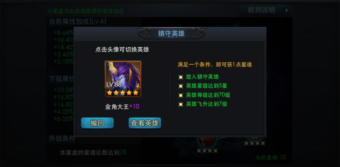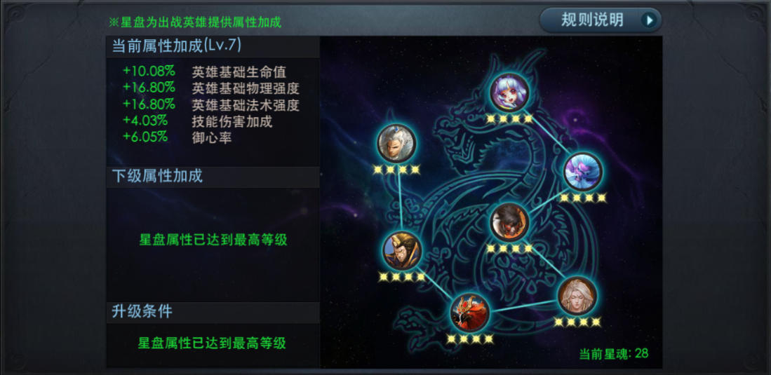 星盘是咱们在游戏中后期非常重要的一个战力提升系统,它能为咱们的英雄提供额外的属性加成。当角色达到70级后就能解锁这个功能,在战阵界面右侧可以找到入口。星盘里有7个星点需要依次解锁,每个星点都可以派驻英雄镇守,这样就能获得星魂。随着星魂总数的增加,出战英雄的基础属性会逐步提升,而且这种加成是全局生效的,不管英雄是否在星盘中都能享受到。