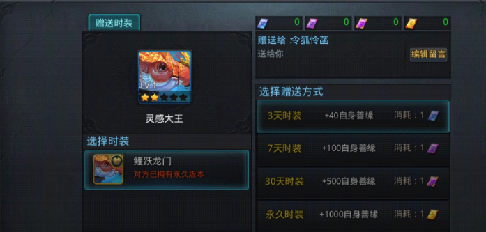 时装不仅是提升角色外观的重要元素,还能通过赠送功能增进好友互动。目前游戏内支持赠送的时装主要分为限时和永久两种类型,包括3天、7天、30天以及永久时装卡。这些时装卡可以通过善缘珍阁兑换或参与特定活动获取,比如3天时装卡需要100善缘值加240元宝,7天时装卡则需要500元宝或凌云壁兑换。赠送时装的前提是双方必须拥有对应英雄,且已添加好友。
