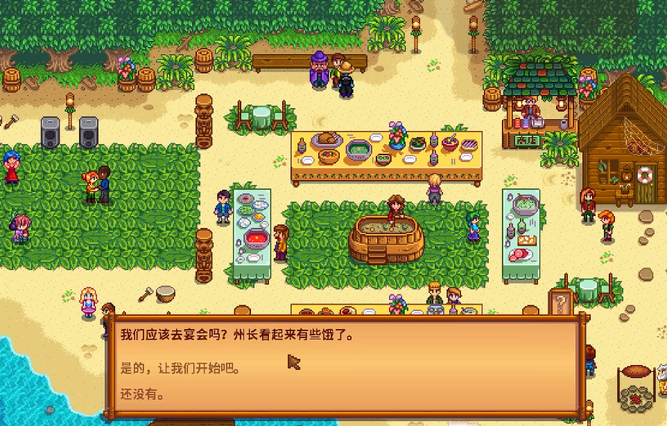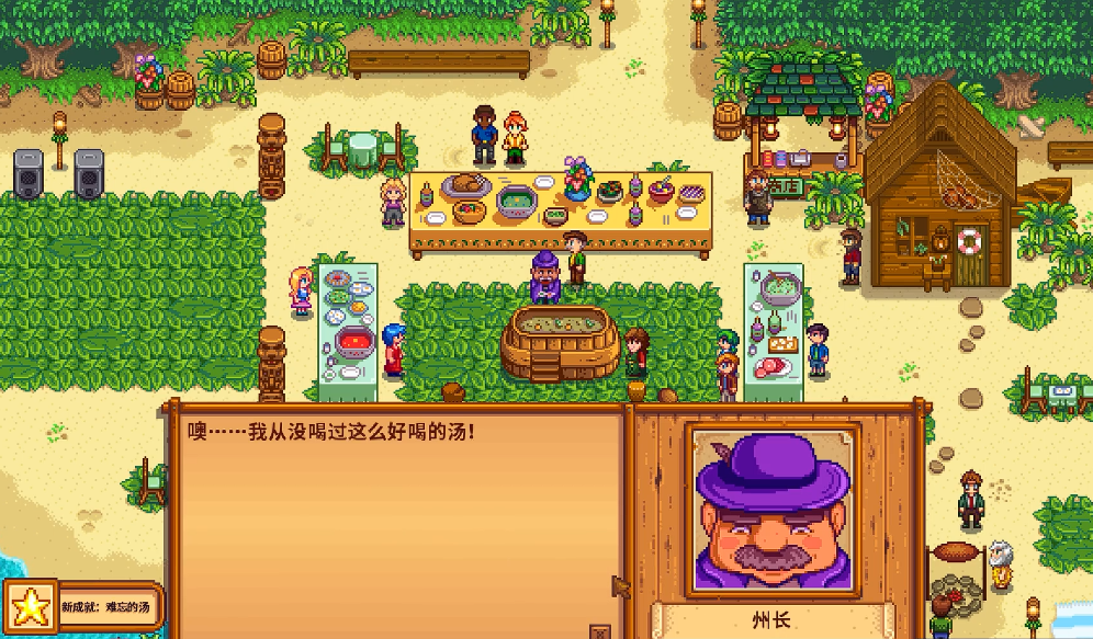 州长最常出现的场合是夏季的夏威夷宴会,这是游戏中的重要节日之一。在这个节日中,小镇居民会聚集在一起熬制百乐汤,而州长作为官方代表负责品尝并评价这锅汤的味道。玩家可以在节日现场直接看到州长站在汤锅旁边,等待品尝环节的开始。这一场景是州长在游戏中最显眼的露面时刻,也是玩家最容易找到他的时机。