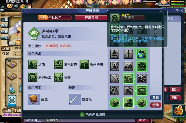 杏林妙手流派的核心在于最大化治疗能力,经脉点法通常选择2233212或2333212。第三层归气能提升治疗量,第二层仁心或化瘀均可,第六层日常任务选佛缘增强治疗,PK则推荐慈心应对点杀战术。该流派适合高难度任务和需要稳定治疗的团队配置,通过经脉加成可将化生寺的群体恢复能力发挥到极致,在持久战中尤为关键。治疗经脉的配置需要平衡即时疗效与持续治疗能力,同时考虑部分经脉对特定技能的额外加成效果。