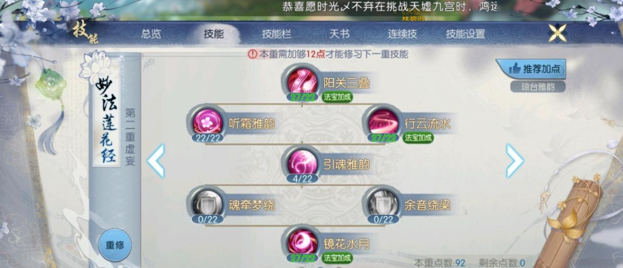一重技能中,矫健和丰沛必满,它们能提升血量和蓝量,让咱们在战斗中更耐揍。鸣泉点满可以增加抗性,配合天书还能提高防御。行云流水是加速技能,点满后跑图或逃命都很实用。二重技能重点加青冥和空行,前者给队友加攻击,后者免疫魅惑,打架时特别关键。三重技能优先云水雅韵和天韵琴心,解控和被动增益对团队帮助很大。