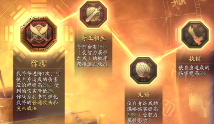 如果你打算让朱儁走输出路线,那么作战系的兵书通常是首选。这套思路的核心是最大化他的谋略伤害。带奇正相生可以配合一些特定战法打出额外效果,而执锐和文韬则能直接提升输出能力,简单粗暴地增加伤害。这么搭配的话,朱儁的加点建议就全往智力上加,让他打人的时候更疼。这个方向比较通用,适合大多数希望朱儁稳定贡献输出的阵容搭配。