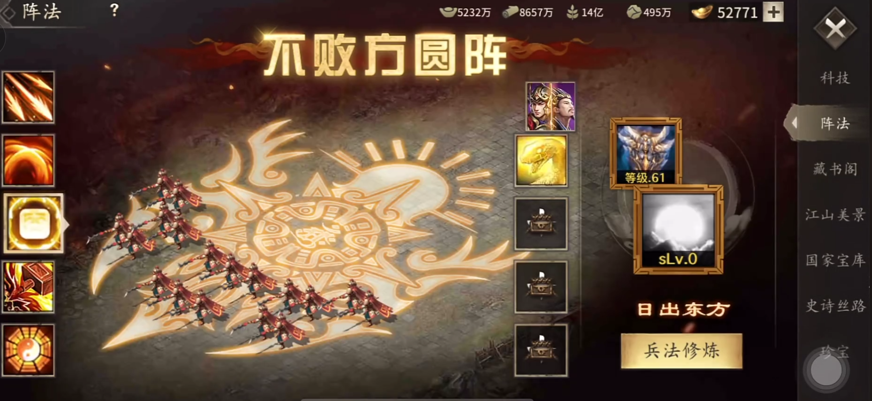 阵法本身是有等级的,提升等级主要依靠你的主将在战斗中积累经验,每次胜利都会为阵法贡献经验值。阵法等级的提高,它带来的效果加成就越强,比如锋矢阵能提升输出伤害,雁形阵增加闪避几率,而方圆阵则强化防御能力。当阵法等级达到70级时,还会解锁一个叫做变阵的特色功能。要想快速提升阵法等级,多参与国战或者挑战NPC是不错的办法。