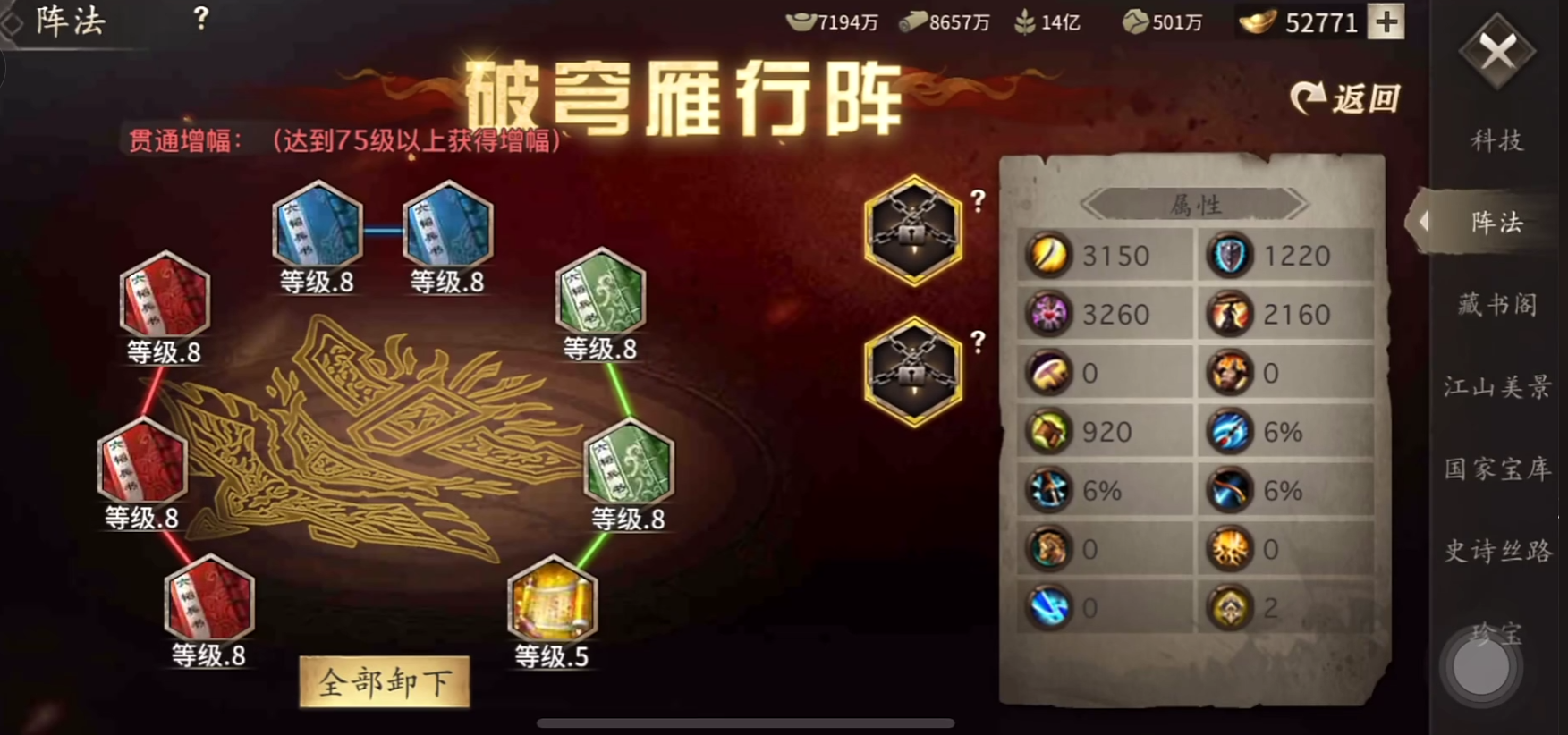 要开启第一个阵法,首先得把角色等级练到210级。还得去挑战并成功通关一个指定的副本,通常这个副本指的是夏侯惇副本,打赢了之后阵法科技才会正式解锁。阵法功能开启后,会看到三种基础阵法可供选择,分别是锋矢阵、雁形阵和方圆阵。初始状态下,每个阵法都只开放了三个位置,也就是说阵法效果不能完全发挥。如果想把阵法的所有位置都解锁,让效果达到满额,就需要为每个阵法支付150金币来激活剩余的空位,三个阵法全开总计是450金币。