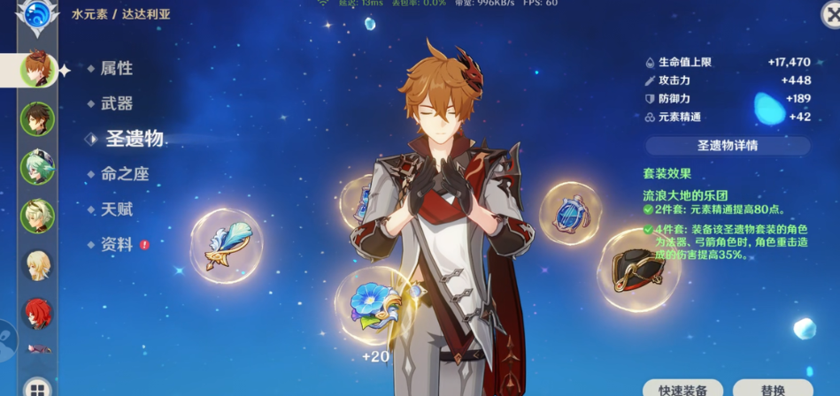 至于圣遗物的主词条选择,空之杯毫无疑问应该优先选择水元素伤害加成,这是提升公子伤害最直接的途径。时之沙通常选择攻击力百分比,以保证基础攻击面板。理之冠的选择则需要根据你武器的副属性来灵活调整:如果武器不带暴击率,那么理之冠优先选择暴击率,以确保稳定触发断流;如果武器提供了可观的暴击率(例如天空之翼),那么可以选择暴击伤害来追求更高的伤害上限。