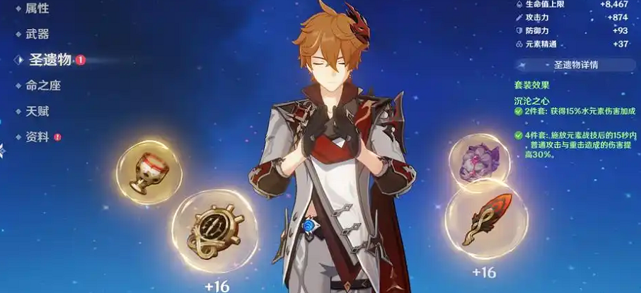 在选择具体的圣遗物套装时,公认最契合公子的毕业级别选择是沉沦之心四件套,也就是玩家常说的水套。这套圣遗物的两件套效果直接提供水元素伤害加成,而四件套效果能在施放元素战技后,显著提升接下来普攻与重击的伤害,这完美契合了公子开启元素战技转入近战模式后的主要输出方式,能够稳定且全面地提升他的持续作战能力。如果你的公子拥有像冬极白星这样的专属武器,水套四件套的收益会更加显著。