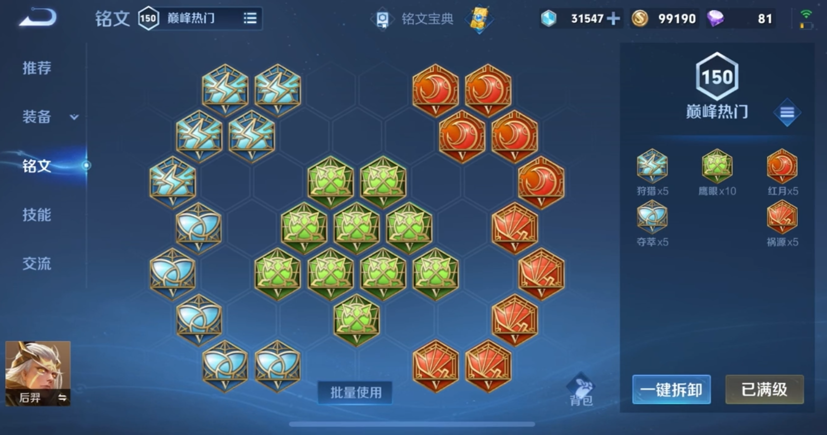 狩猎铭文提供攻速和移速,能让你走A更顺手,逃跑或追击时也灵活一些;夺萃铭文则提供物理吸血,让你在对线时可以靠打小兵回复生命值,减少回城的次数,能一直赖在线上发育。如果打法比较激进,或者辅助不太能保护你,也可以考虑多带几个夺萃来增强赖线能力。后羿通用铭文就是,红色10红月、绿色10鹰眼、蓝色5狩猎5夺萃。兼顾了攻速、暴击、穿透、移速和吸血,属性非常全面。