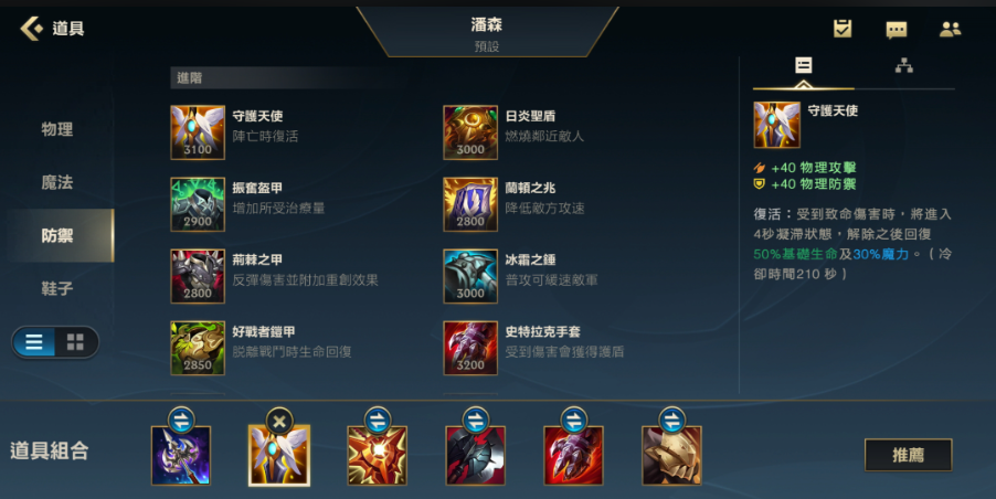 目前主流的出装思路大致可以分为两种,一种是偏向半肉装的征服者流,另一种是追求极致爆发的穿甲流。征服者流是现在最稳也最通用的玩法,出装顺序通常是黑色切割者起手,这件装备能提供攻击力、生命值和冷却缩减,还有非常重要的破甲效果,和潘森的技能机制非常搭。第二件通常会选择幽梦之魂,它提供的穿甲、攻击力和主动加速效果,能大幅提升潘森的游走支援和刺杀能力。后续的装备会根据战局来定,如果想打得更凶更主动,可以补死亡之舞和斯特拉克的挑战护手;如果需要承担更多的前排任务,正义荣耀、兰顿之兆和守护天使都是不错的选择。这套出装的核心思路就是用黑切和幽梦保证前中期的伤害,后续补肉装来提升容错率,让潘森在团战中既能进场打输出,又能利用三技能的盾牌抵挡关键伤害,不至于一进场就被融化。