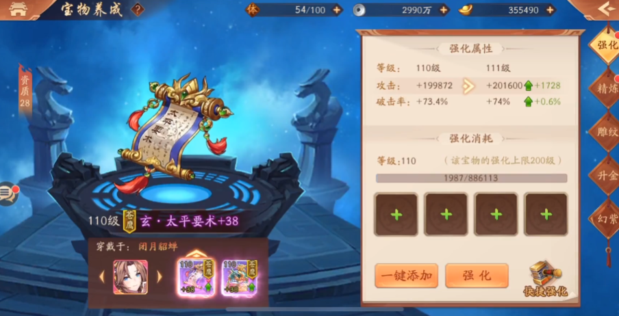 宝物的获取和培养需要合理规划资源。红色宝物主要通过酒馆抽奖、历练模式、秘境寻宝和限时活动获得,其中秘境寻宝是日常碎片获取的主要途径,建议每天完成免费次数并优先挑战低战力玩家以提高成功率。宝物精炼每级可增加3%属性,最高精炼至15级;强化每五级提升3%,强化到100级可提供60%加成,初期建议将所有武将的宝物强化至12级激活基础效果,再集中资源培养核心武将的宝物,以逐步积累战力优势。