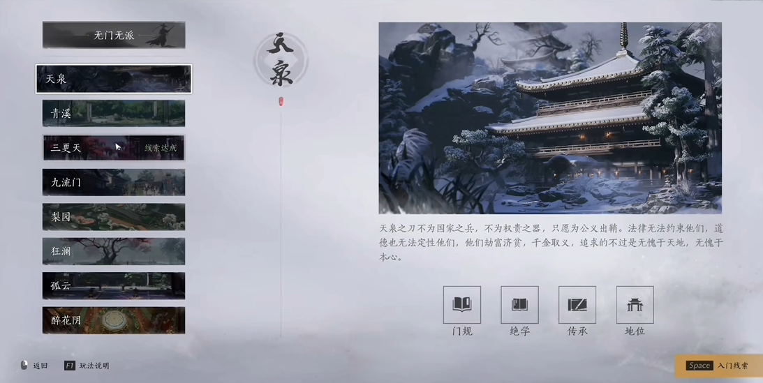 要学习天泉门派的绝技,玩家需要先加入这个以公义为核心的江湖势力,加入方法包括寻找丰禾村山顶的张一豪直接对话,或者通过累积消费长鸣玉购买物品获得邀请函,在与糖宝互动购买相关心法后,最终与历博渊完成对话即可正式入门,这一步为解锁天泉绝技奠定了基础。