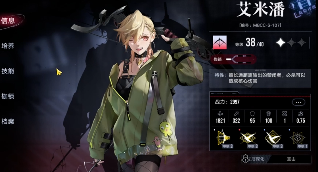 艾米潘的技能设计突出了她的高伤害和功能性,她拥有超远的攻击范围,可以覆盖半个战场以上,适合远程物理输出。她的技能附带破核效果,能够击破敌人的核心弱点,并且在成功击杀敌人后可以回复能量并刷新大招,这让她在连续战斗中保持高效的输出循环。被动效果进一步强化了她的输出能力,例如提升暴击伤害或减少技能冷却,使得她在前期和中期的关卡中能快速清理敌人。