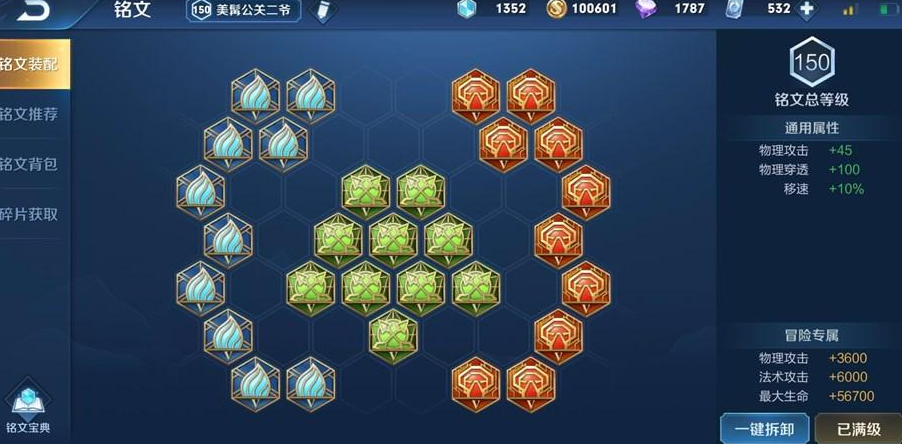 铭文搭配对关羽来说同样重要,推荐使用隐匿、鹰眼和异变这套组合,它能提供可观的物理攻击、穿透和移速加成,让关羽在追击或逃跑时都更灵活。隐匿提供的移速加成能让关羽更快进入冲锋状态,鹰眼和异变则增强物理穿透,确保他的技能和普攻能有效削减敌人血量。这套铭文让关羽在前期对线时就能占据优势,通过快速推线和游走支援来带动全场节奏。