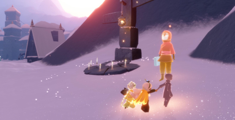 进入霞谷后抵达的第一个大型区域是溜冰场,这里可以找到第一位先祖。玩家需要控制角色从入口平稳进入溜冰场,避免因速度过快直接滑入冰湖中心。沿着右侧的小道或高台行走,在溜冰场右侧的半山腰或高墙凹陷处,便能发现这位呈现叉腰站姿的先祖。在滑行赛道中,玩家会遇到第二位先祖。当沿着赛道滑行至中途,会经过一个左侧转弯,此时右侧会出现一个显眼的小亭子。靠近亭子区域便会触发蓝色的先祖记忆光点,跟随光点完成赛道并抵达终点,即可解锁这位双手交叉站立的先祖。