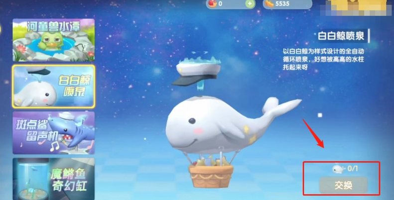 钓到白白鲸后,你可以去找神秘商人大力兑换一个白白鲸喷泉装饰,大力位于爱心广场,他的帽子是美元符号,旁边有一辆跑车。这个喷泉可以放置在家园中,它不仅外观可爱,还能互动玩耍,白白鲸会喷出泉水将帽子顶上天再落下,看起来非常生动。这个装饰品能提升家园的美观度,是许多玩家追求的目标,同时钓到白白鲸还能解锁图鉴获得智慧经验。