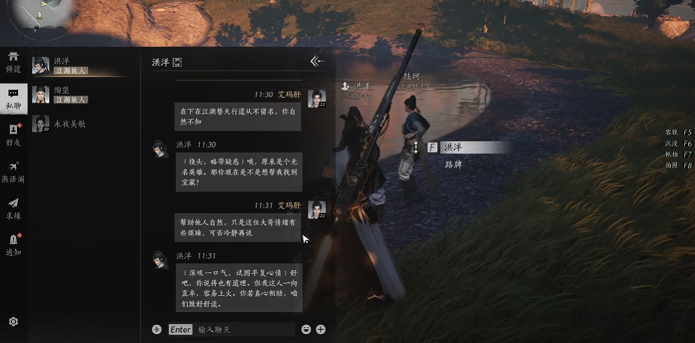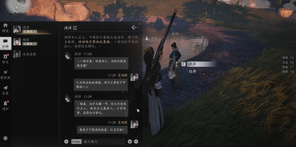 除了基础的结识对话,洪洋还与清河地区的抱山湖秘宝任务线索相关联。玩家在湖边与他对话后,有可能获得关于寻找秘宝的初步提示。该任务后续可能涉及到在竹林废屋完成灯笼解谜以获得一把钥匙,以及前往龙虎寨洞窟用特定方式开启石门获取另一把钥匙。玩家需要返回抱山湖区域的特定洞穴,使用收集到的钥匙来开启秘宝。找到洪洋不仅仅是完成一个简单的社交互动,也可能是开启一段探索旅程的起点。成功找到他后,通过一套以安抚和劝导为核心的对话序列,可以顺利与之结识。