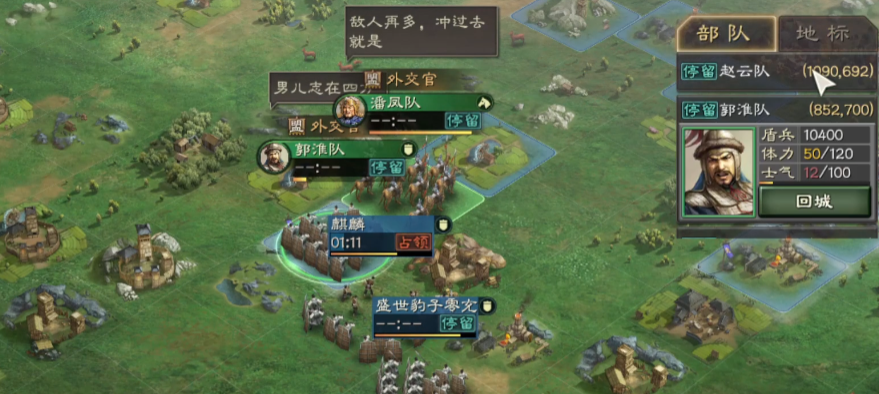 进攻时的战术执行与部队协同直接影响最终战果。发起攻击前,应让队伍在目标地附近驻守,待士气恢复至100再出击,以保证输出效率。战斗由主力队率先接敌,需密切关注战况:若主力队与第一队守军战平或陷入劣势,应立即派遣清扫队进场支援;若主力队战胜第一队但剩余兵力低于1000,则建议让补刀队解决残敌,为主力队迎战第二队保存实力。整个过程必须严格控制在5分钟内,形成高效的主力消耗、清扫补刀节奏。