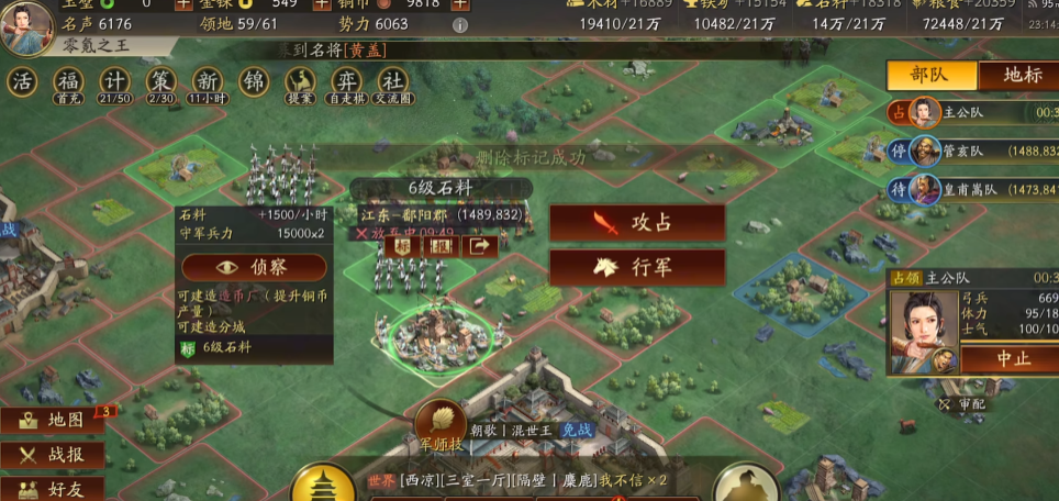 侦查与阵容搭配是降低战损、提高成功率的关键环节。出兵前务必使用斥候侦查,虽然仅能获悉第一队守军的兵种和阵容信息,但据此可以优先选择兵种被自己克制或守将为紫色武将的较弱地块作为目标。第二队守军的兵种往往是随机的,且常与第一队形成互补,例如第一队是骑兵时第二队常为弓兵,因此不应完全依赖针对第一队的兵种克制,选择自身相性高、综合能力强的阵容更为稳妥。主力武将最好完成觉醒,并将核心战法等级尽量提升至满级,以最大化战斗力。